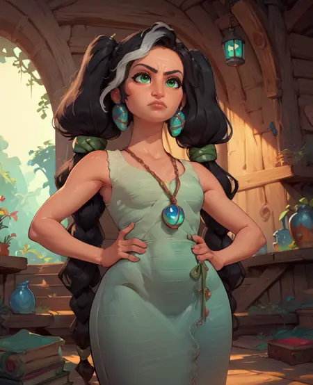 Hope, 녹색 눈, 검은 줄무늬가 있는 머리카락, 긴 트윈테일 또는 트윈 브레이드, 긴 머리 또는 매우 긴 머리,