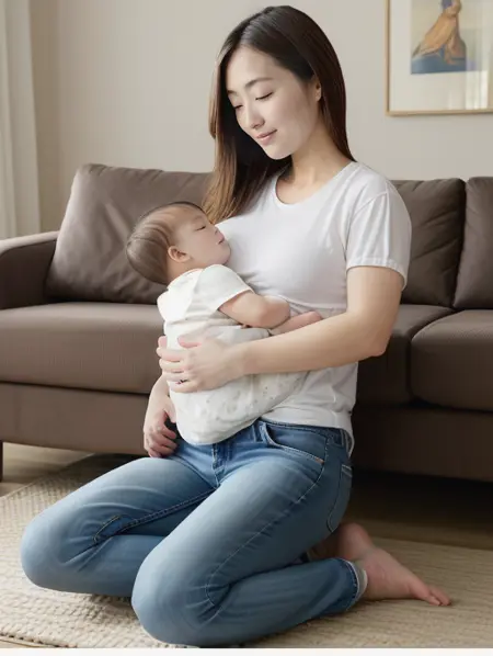 追加で役立つ可能性のある言葉:1baby、母親が赤ちゃんと抱っこ、母親と赤ちゃん、母性的、ソファ、リビングルーム