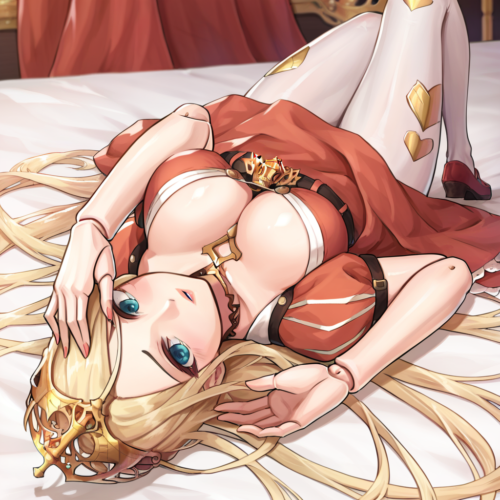 DNF_Queen_Clara, 1girl, solo, blue eyes, blonde hair, very long hair, doll joints, joints, large breasts, cleavage, crown, jewelry, necklace, red dress, puffy sleeves, puffy short sleeves, short sleeves, pantyhose, shoes, red footwear