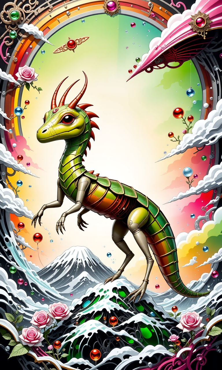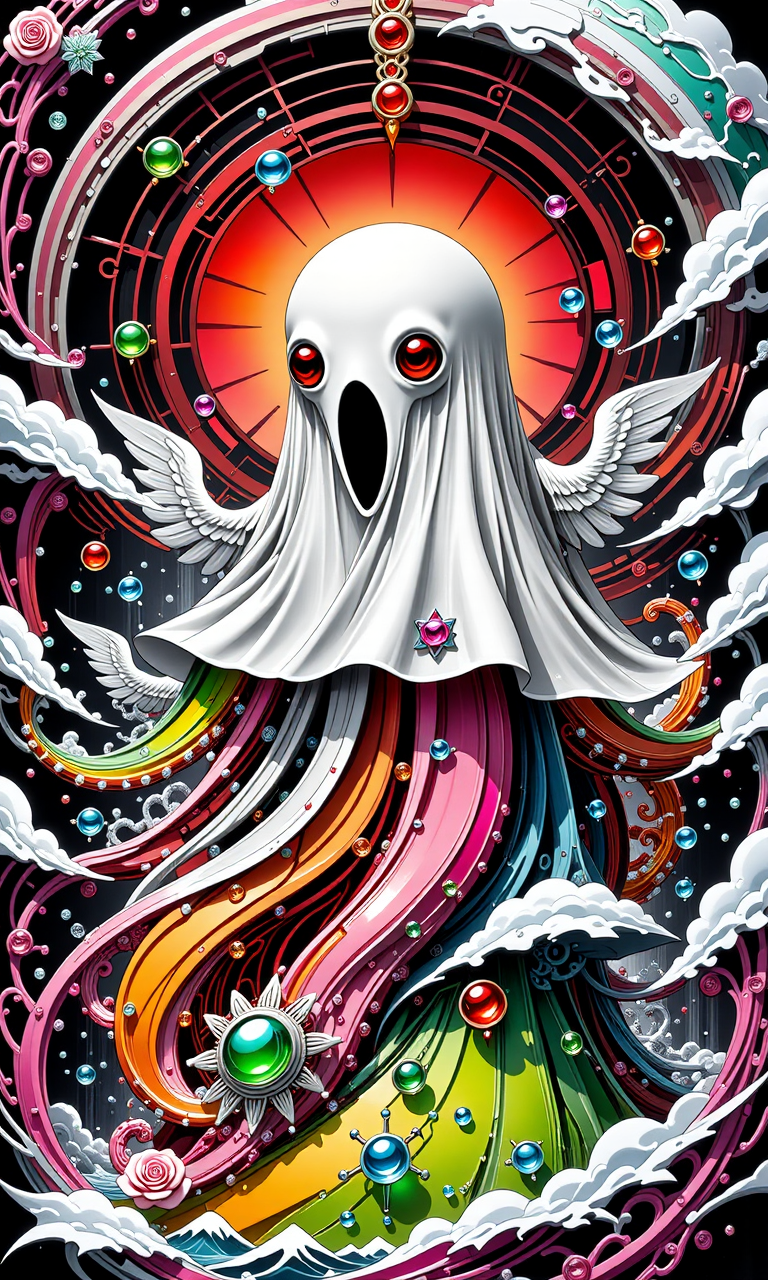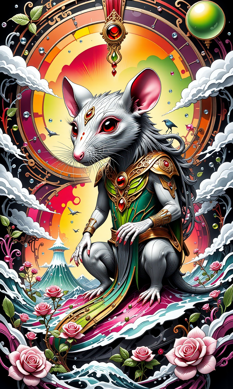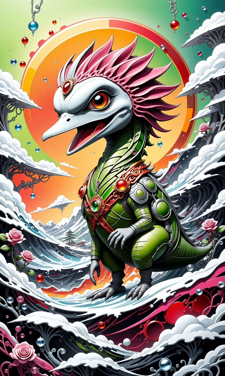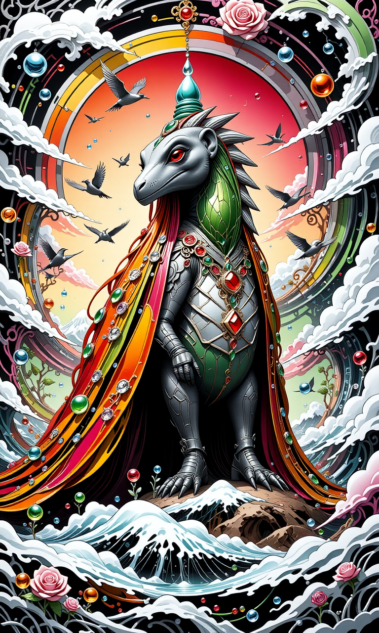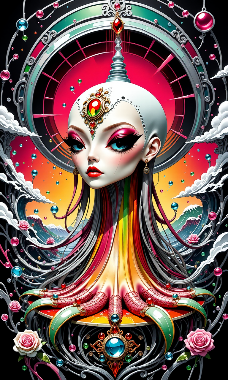 #yourSceneDescription, in the sweetChaosVibe illustration style, Psychedelic colorful Japanese-inspired digital art, vibrant rainbow gradients, stylized waves, and jewel accents in the style of The Great Wave off Kanagawa meets tech-art, high detail illustration