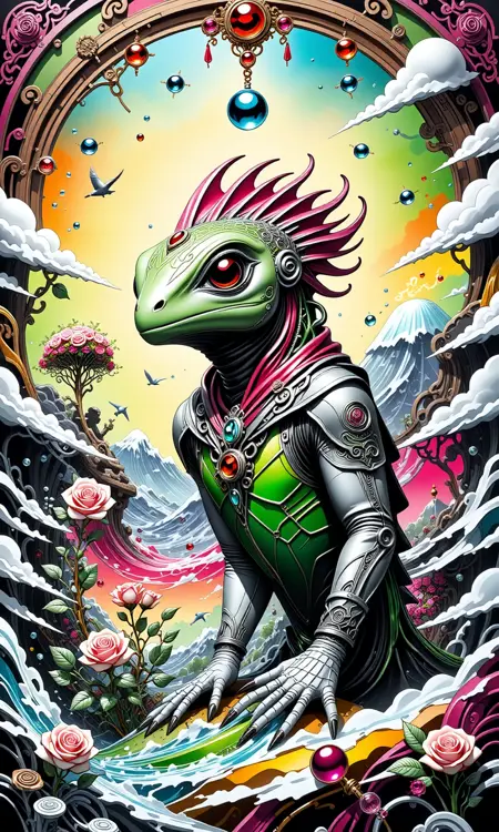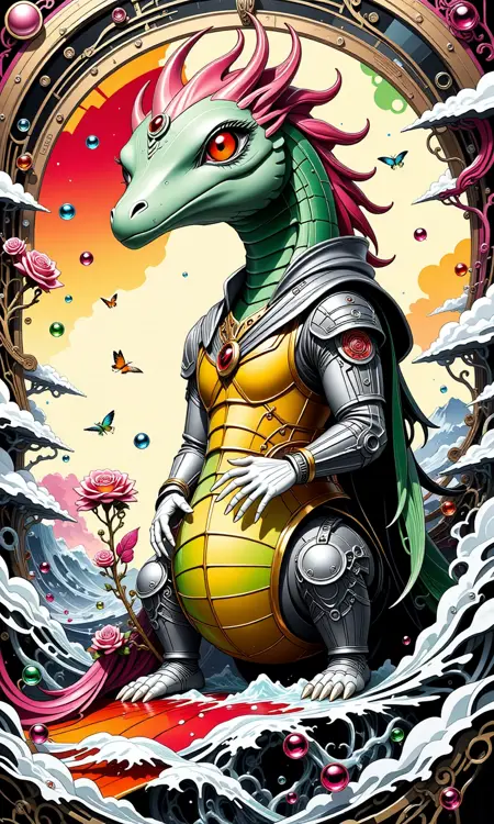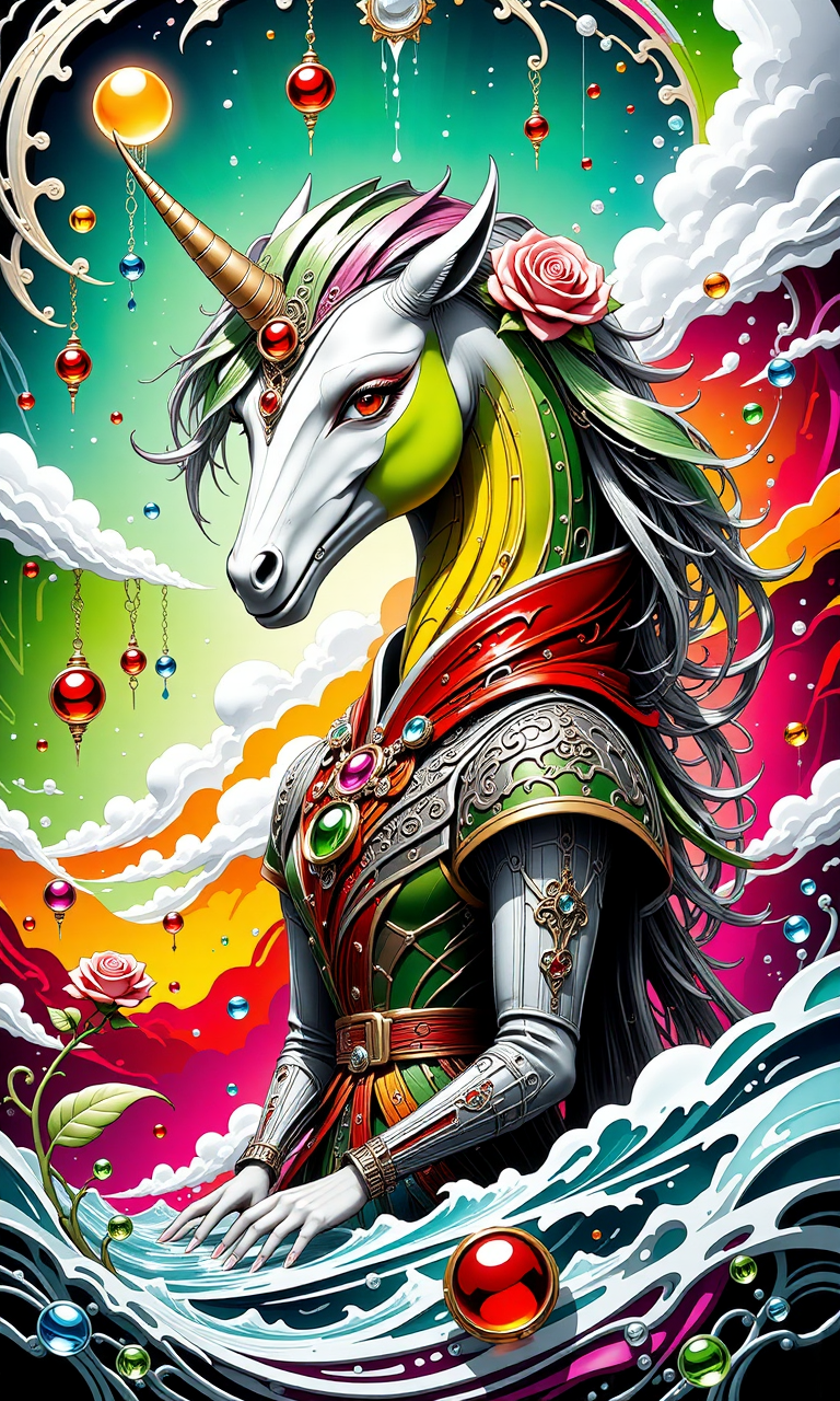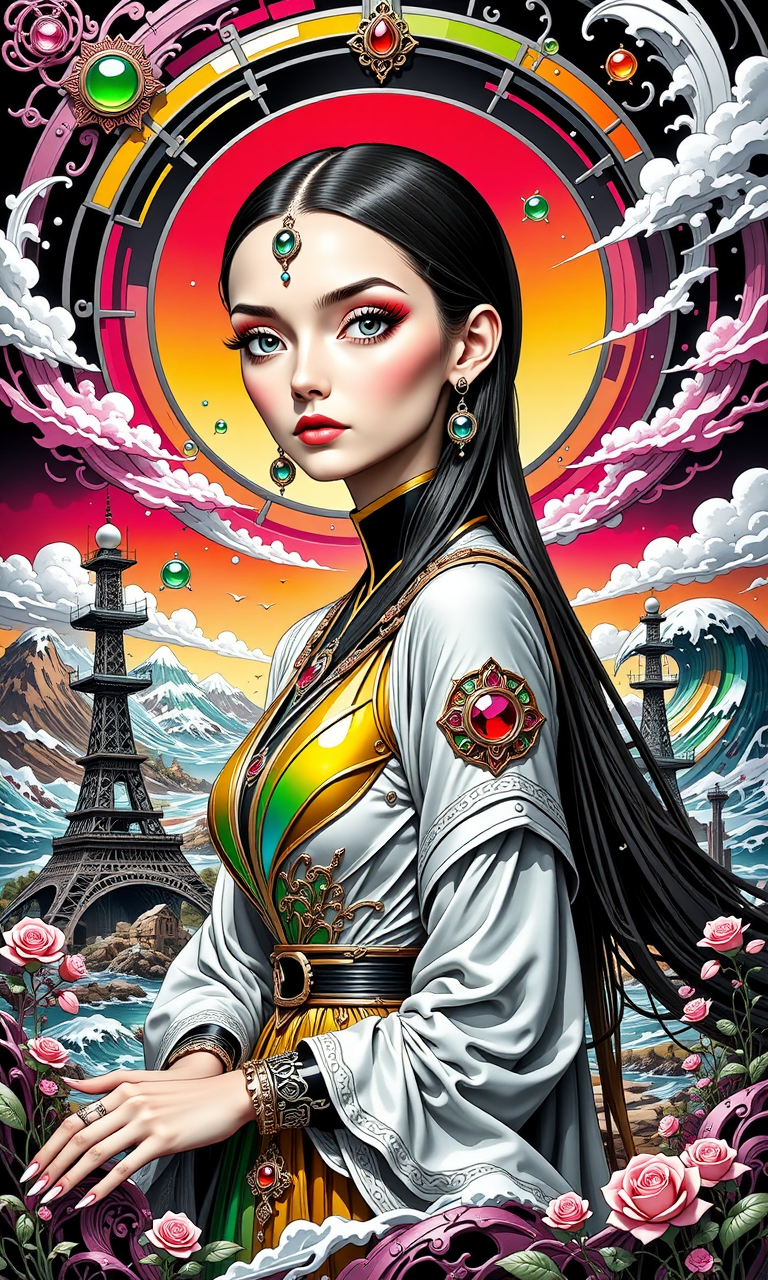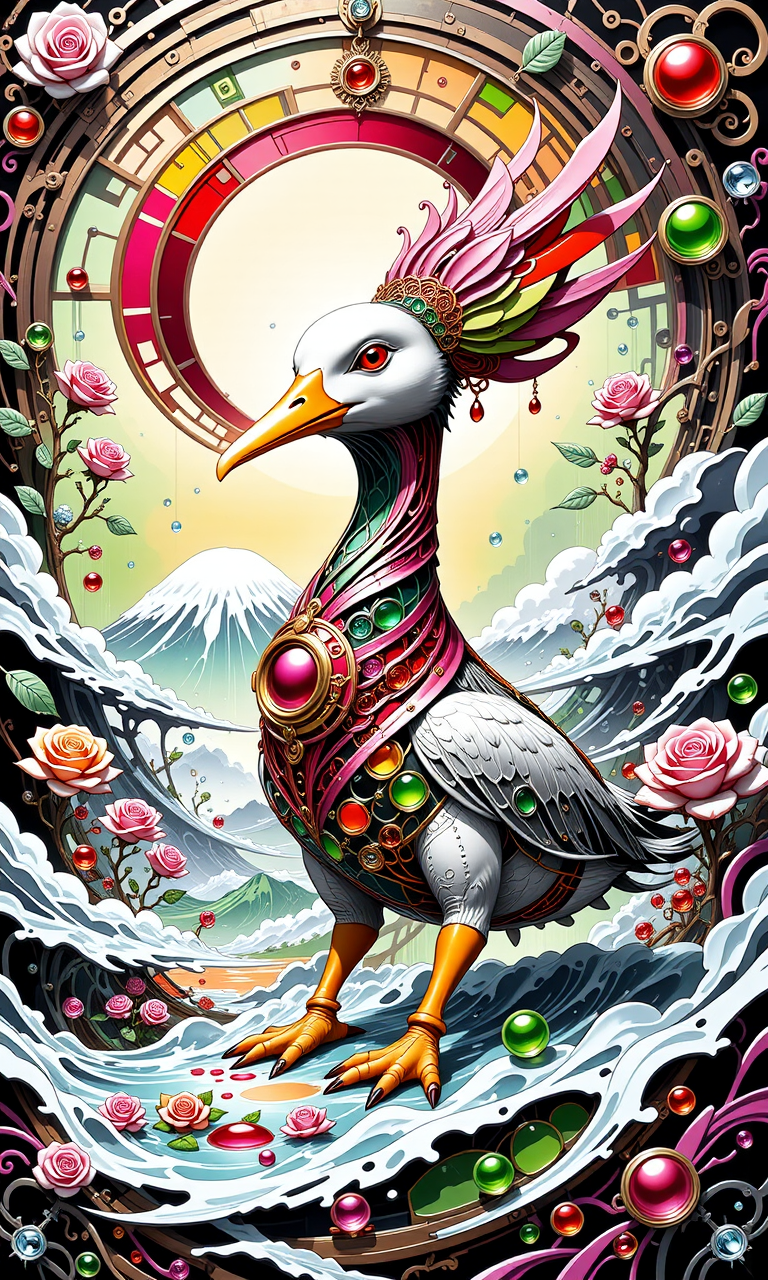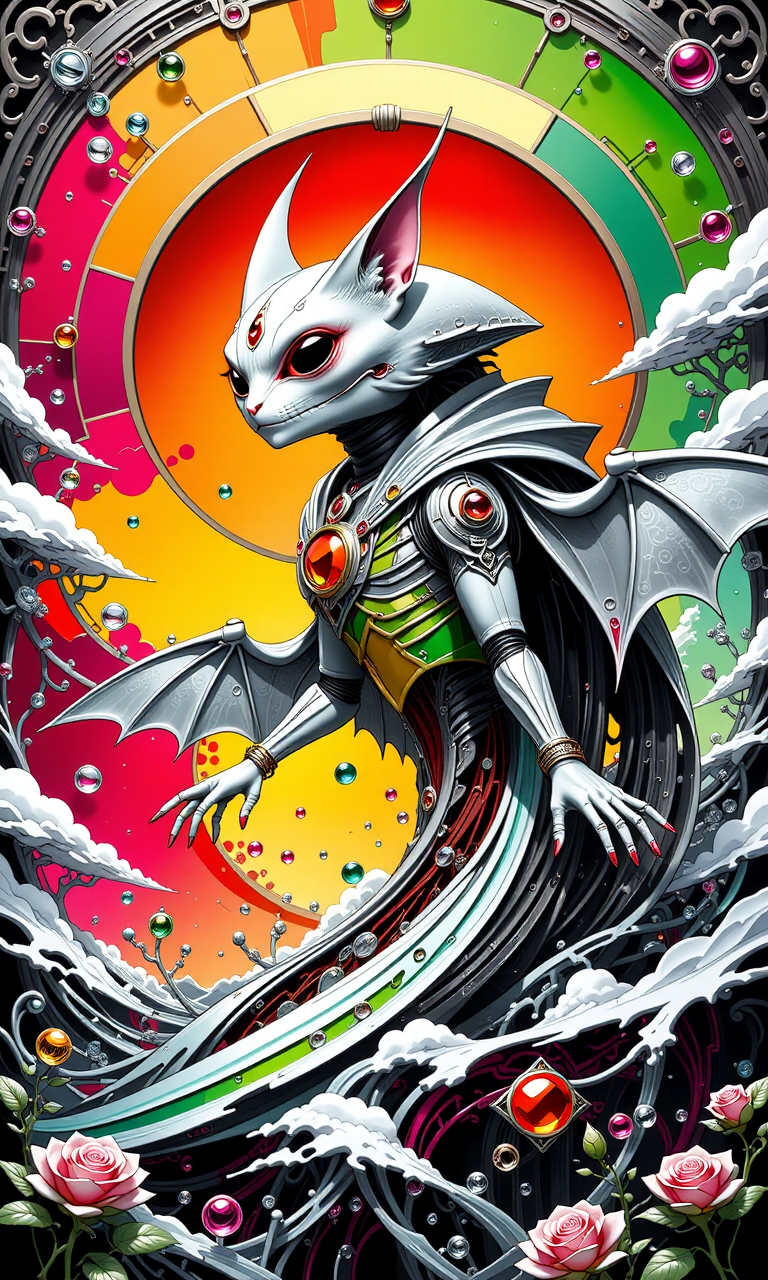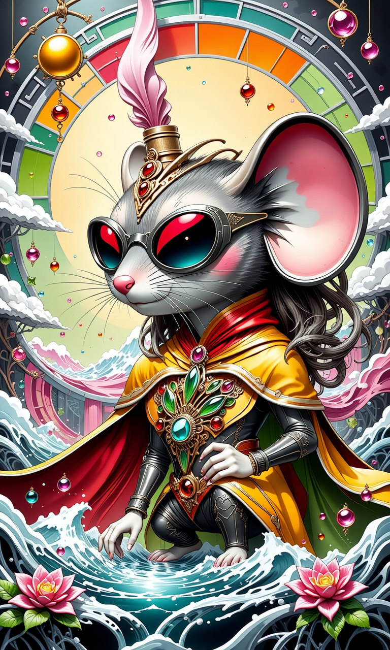 #yourSceneDescription, in the sweetChaosVibe illustration style, Psychedelic colorful Japanese-inspired digital art, vibrant rainbow gradients, stylized waves, and jewel accents in the style of The Great Wave off Kanagawa meets tech-art, high detail illustration