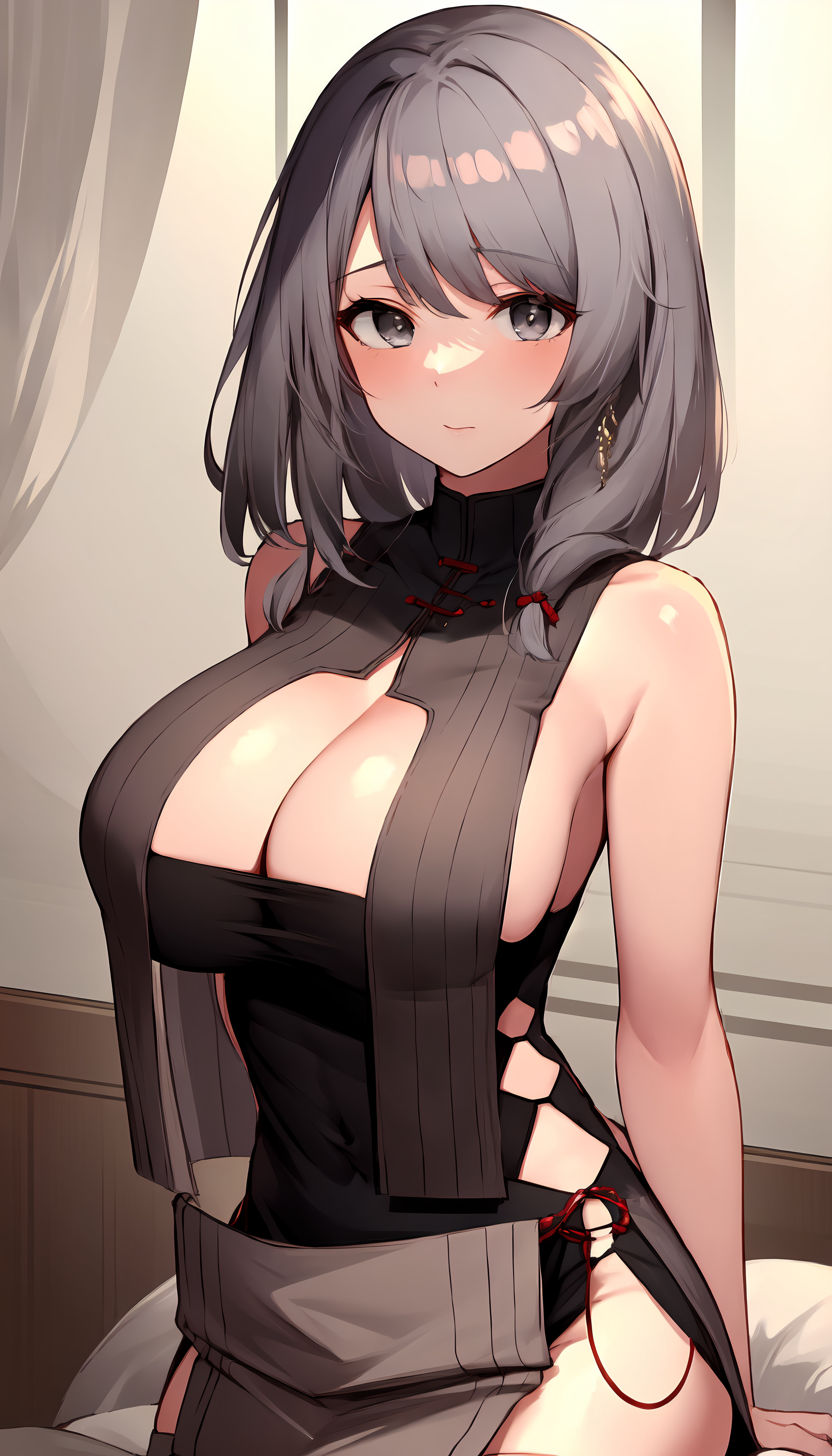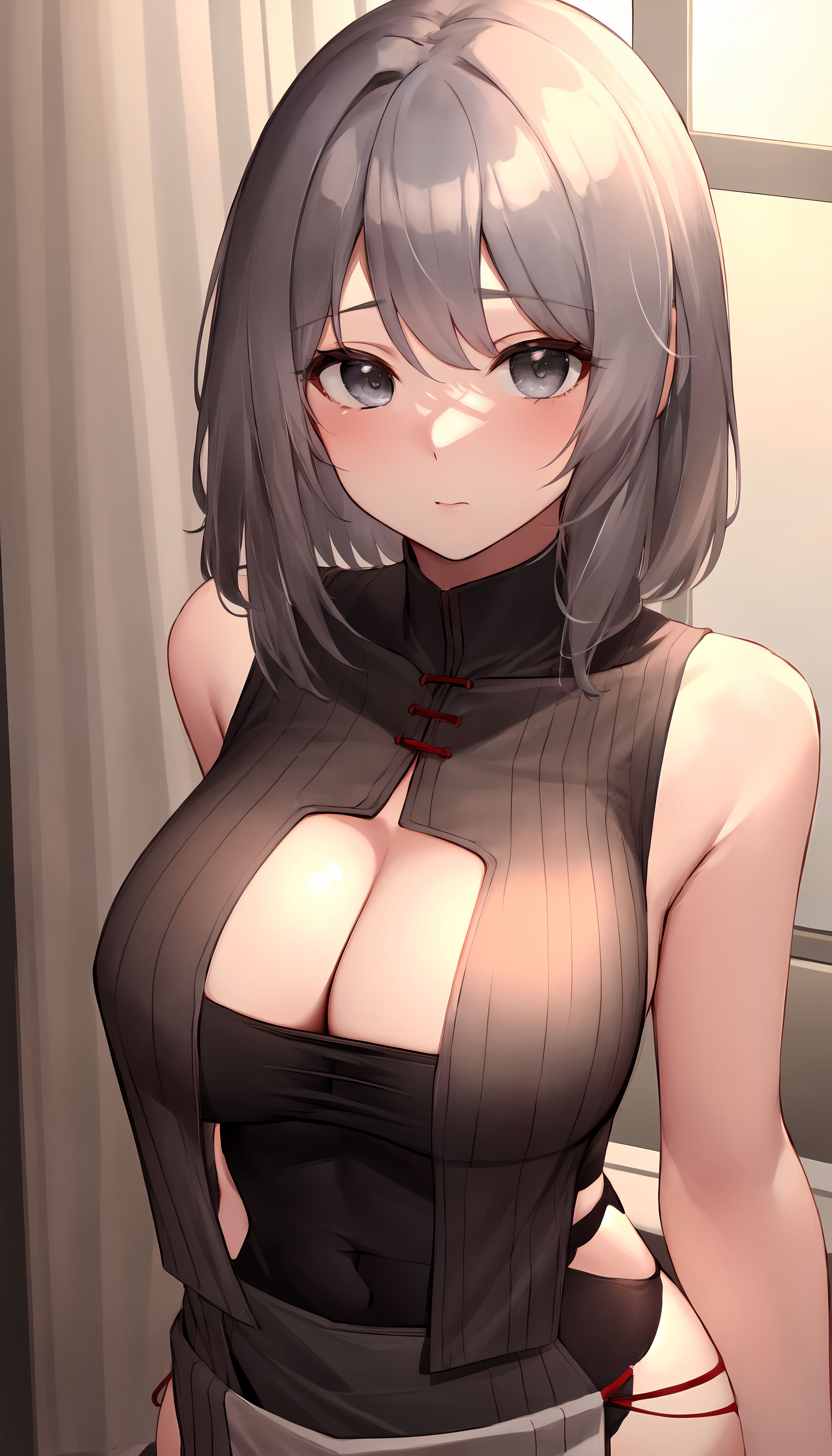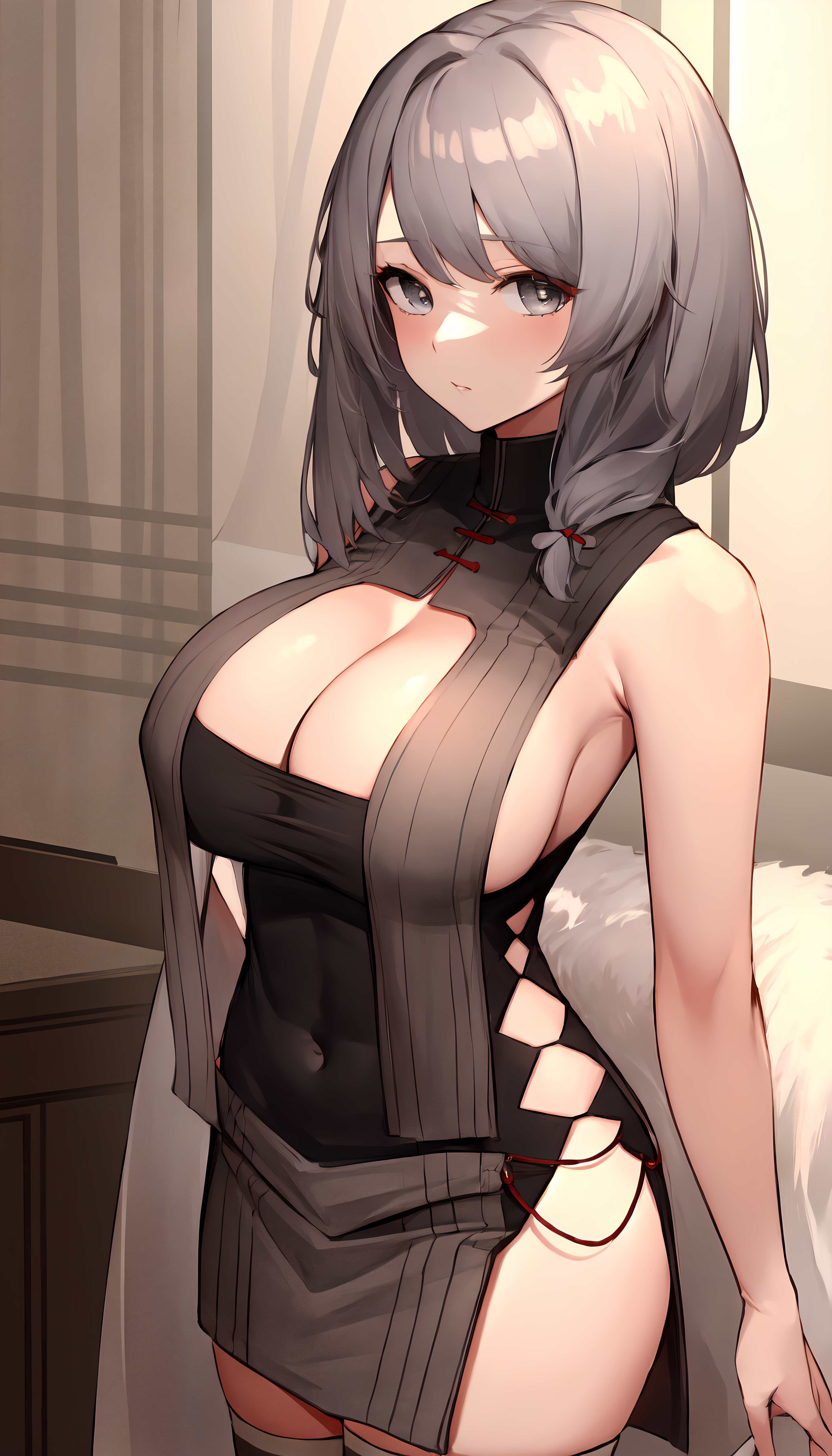 charybdress, 1girl, grey hair, dress neckline, solo, thighhighs, breast curtains;