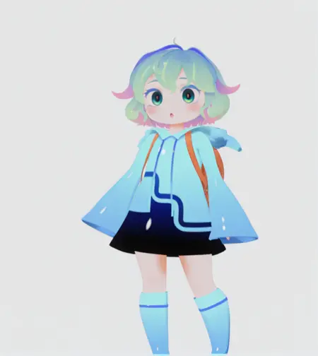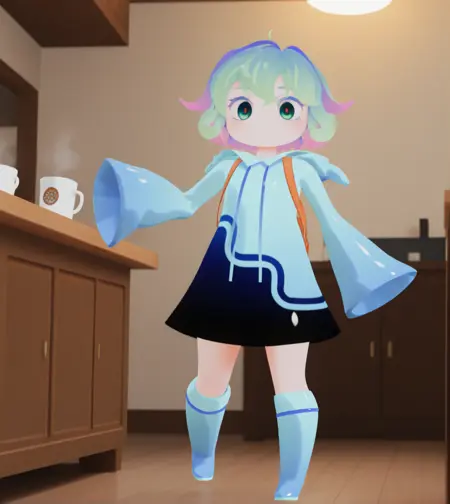 clothe: 青いフーディー、手首より長い袖、長袖、下着なし、バッグ、青い靴、ブーツ、