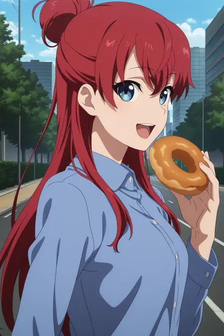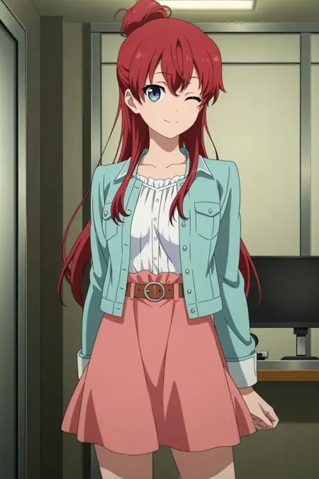 sakaki shizuka, 长发, 红发, 单发髻, 发丝遮眼, 蓝眼, 长袖, 水蓝色夹克, 开襟夹克, 白色衬衫, 粉色裙子, 腰带, 白色袜子, 踝袜, 棕色鞋子, 高跟鞋