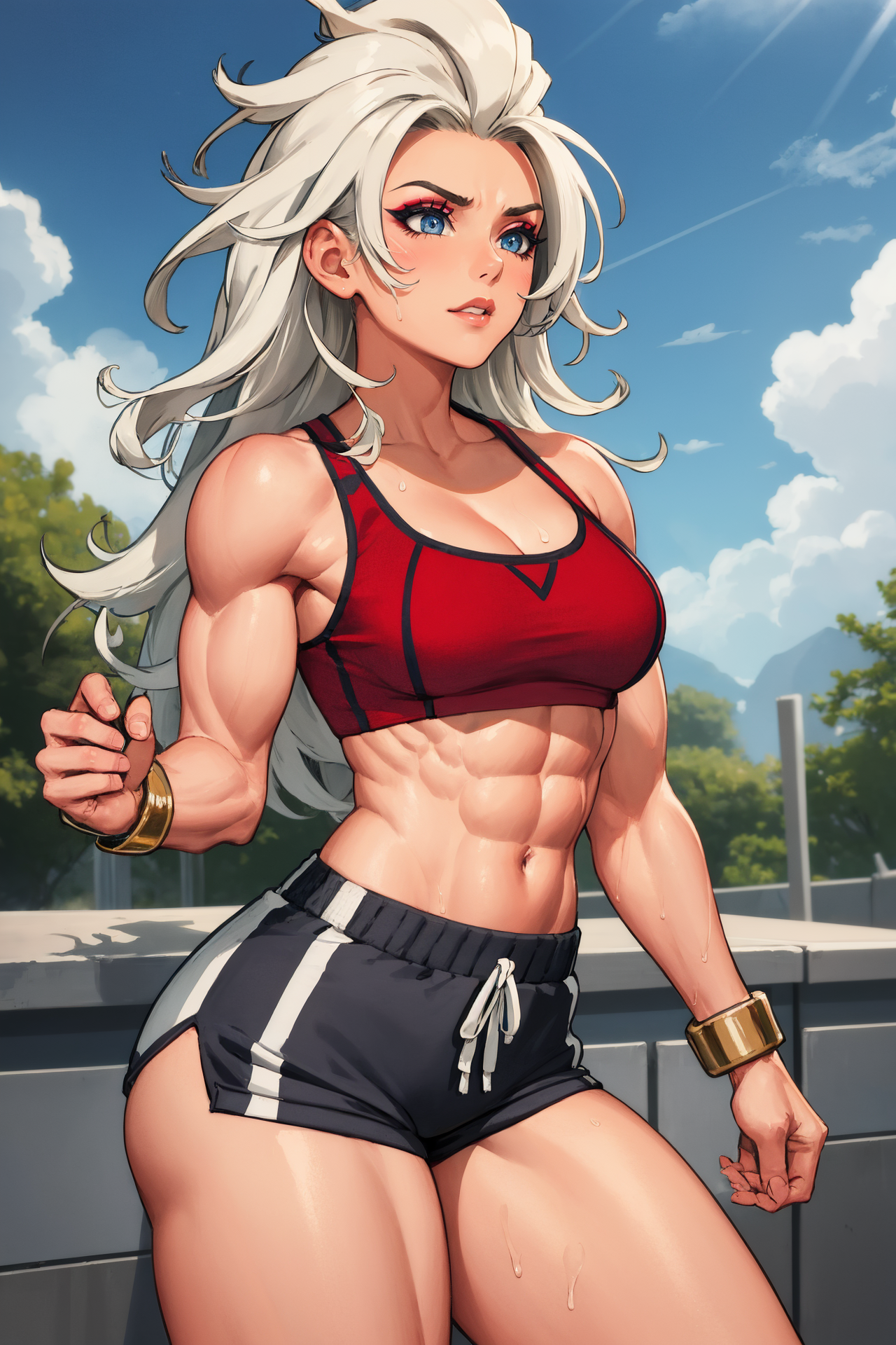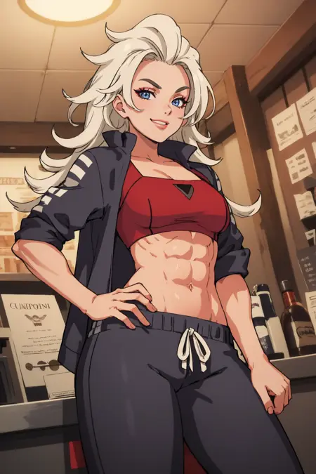 • ゲーム内の衣装: "筋肉質、腹筋、短めのジャケット、開いたジャケット、腹部露出、カプリパンツ、赤いキャミソール"。