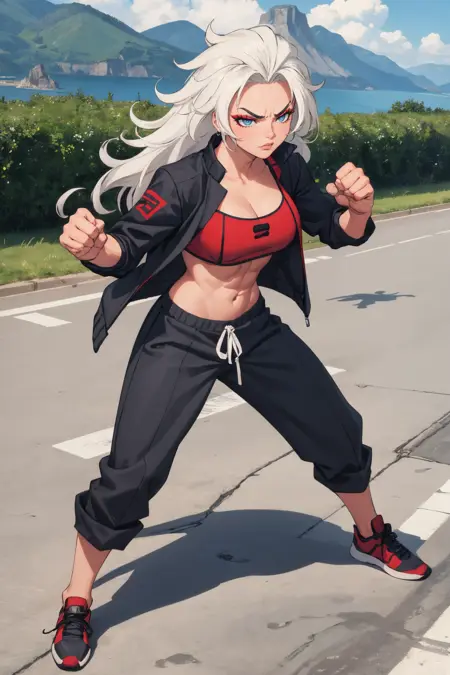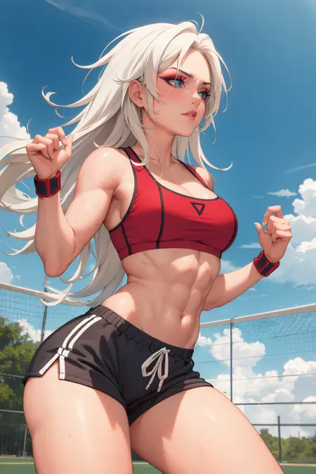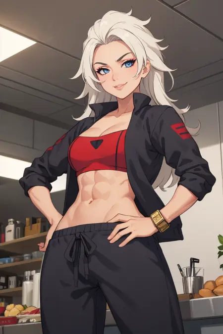ゲーム内の衣装: "筋肉質、腹筋、短めのジャケット、開いたジャケット、腹部露出、カプリパンツ、赤いキャミソール"。