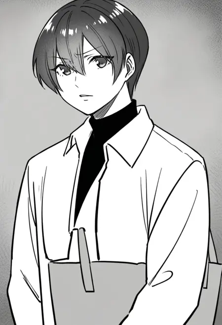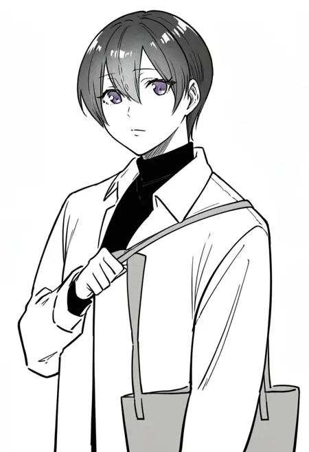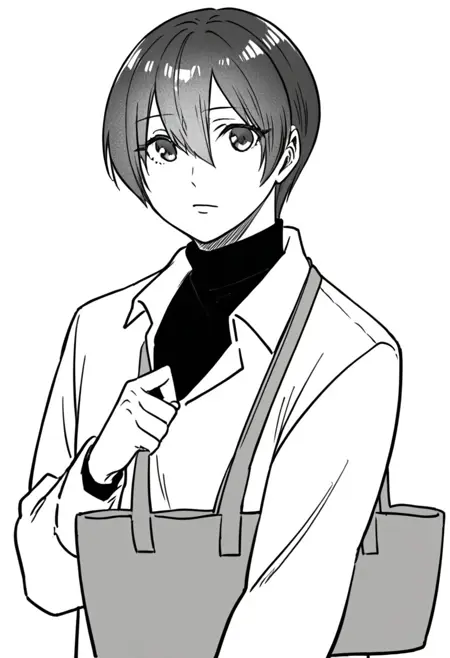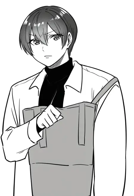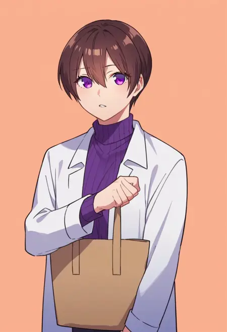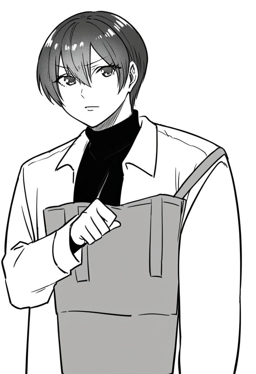 衣装: ラボコート、コート、長袖、シャツの衿、シャツ、バッグ、アンダーシャツ、エプロン、タートルネックセーター、