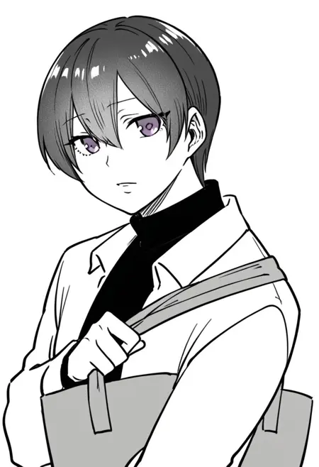 デフォルト: ハヤト、濃い茶色の髪、短い髪、眉間の髪、紫の目、大きな胸、