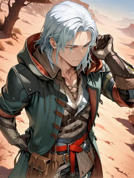 태그(옷): 남성 호프 갑옷, 1남자, 남성 초점, 혼자, 후드 착용, 전체 신체, 단순한 배경, 서 있는 자세, 흰색 배경, 시청자 바라보기, 녹색 코트, 녹색 후드, 갈색 모자, 갈색 무릎 부츠, 흰색 바지, 흰색 셔츠, 빨간 벨트, 갈색 주머니, 흰색 장갑