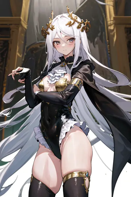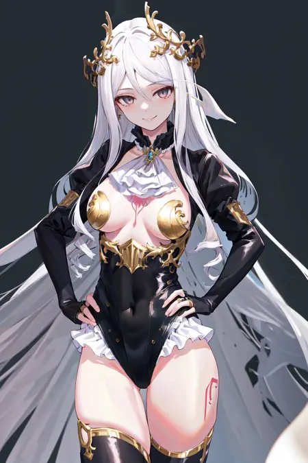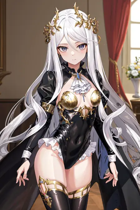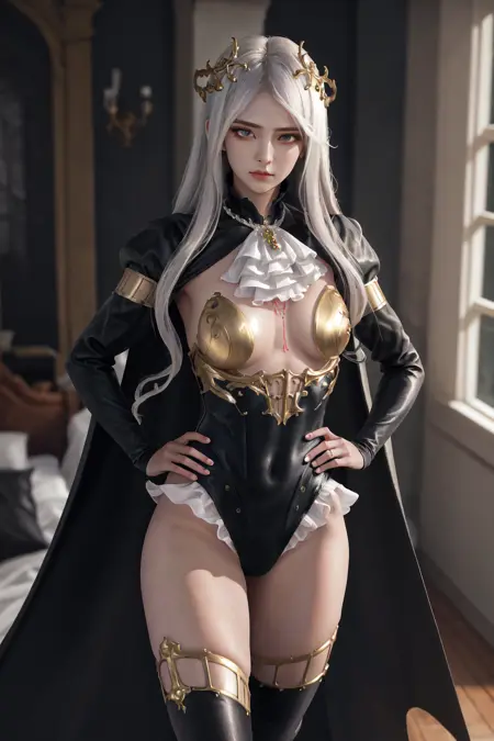 デフォルトの衣装:黒いレオタード、フリル、白いアスコット、ジュエリー、長袖、黒い袖、ブライダルの手袋、黒い太ももハイ、ショール(衣装)、黒いケープ、タトゥー