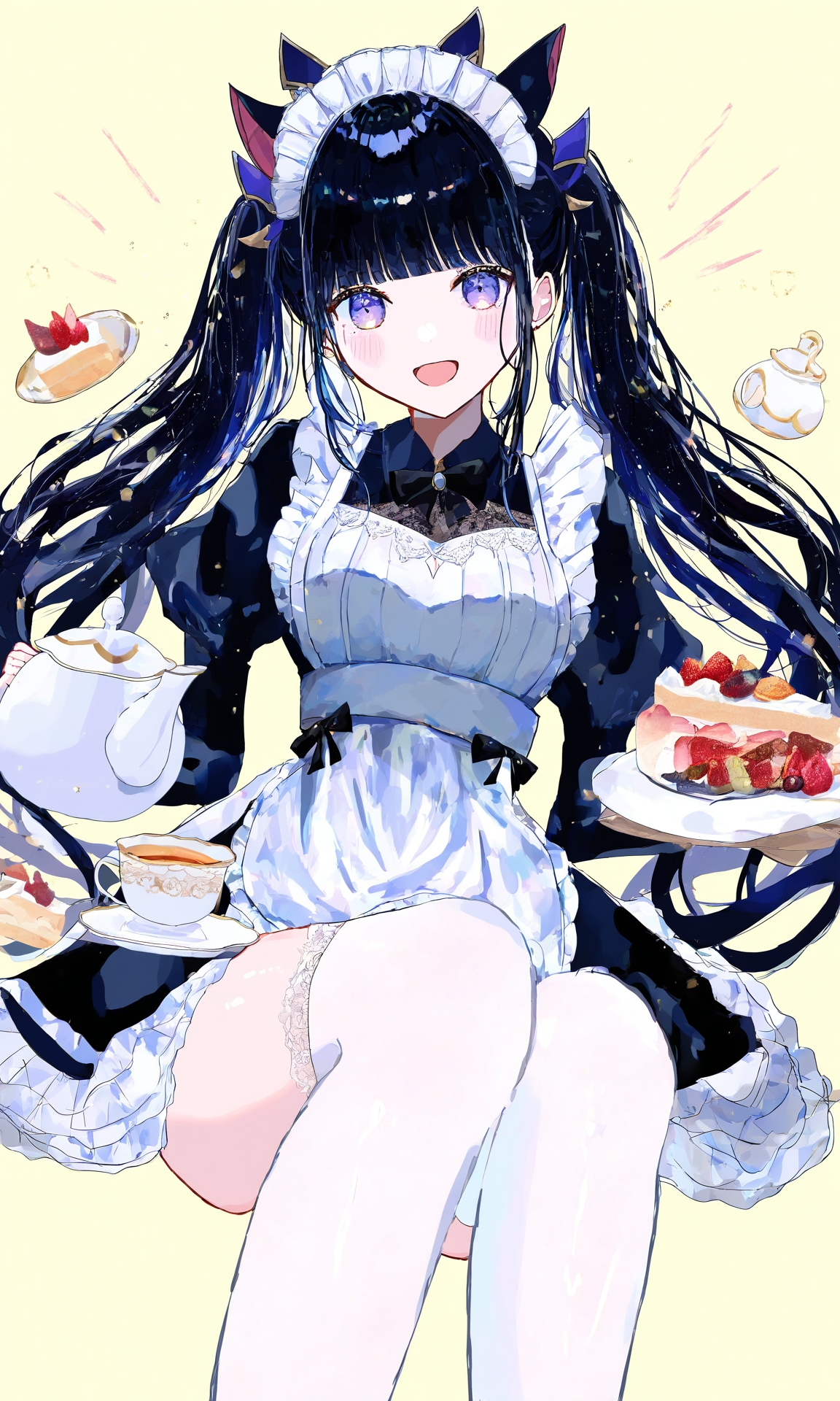 1 girl, nelle, nelle\(p&d\), black hair, purple eyes, cat ears, thighs,
