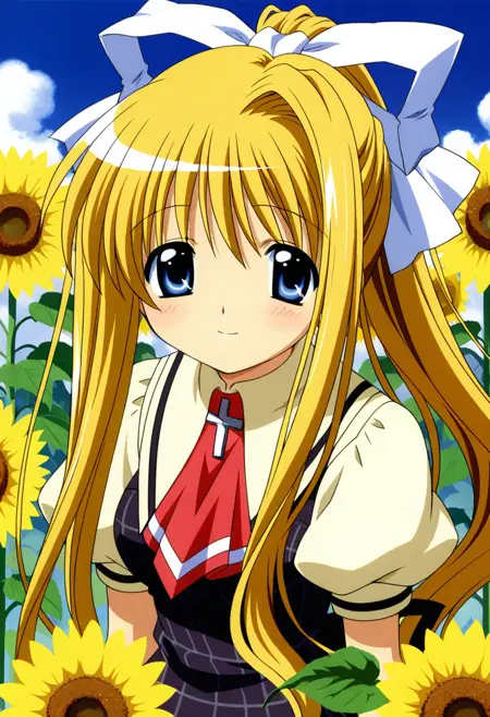 - kamio misuzu,long hair,blue eyes,ponytail,hair ribbon,blonde hair,