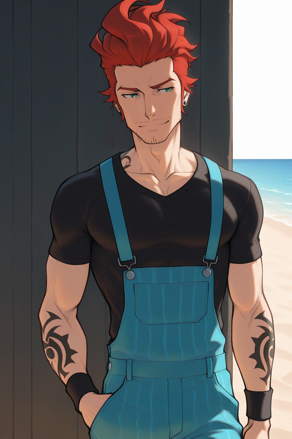 Carpenter, red hair, spiky hair, green eyes, tattoo, suspenders, overalls