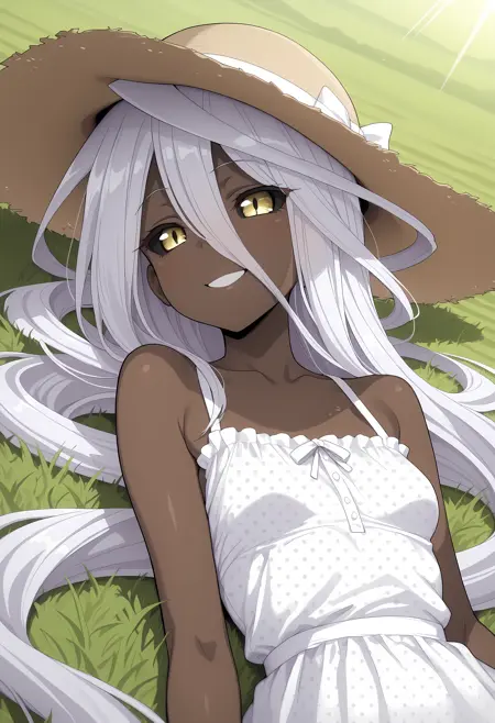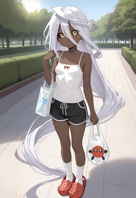 说明:她在动漫中总是以裸体出现,因此没有可展示的服装。从技术上讲,她用头发作为“服装”。你可以尝试使用以下提示来实现遮盖效果:头发遮蔽、乳头遮盖、隐私部位遮盖 或类似内容。