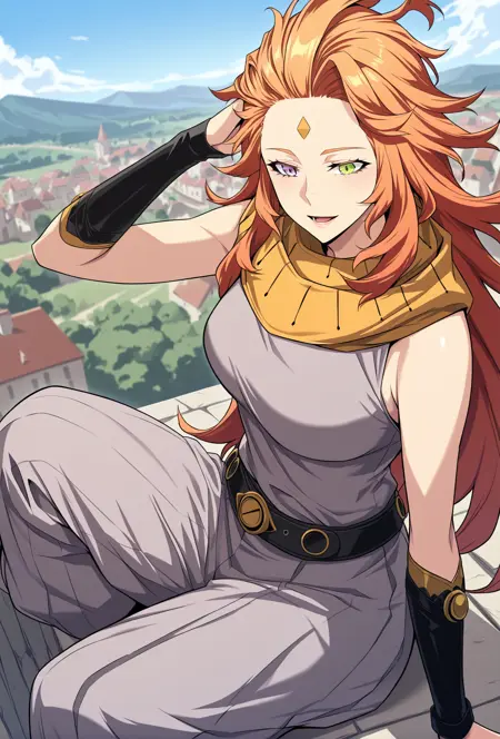 Nix, 1 girl, solo, orange hair, long hair, spiky hair, swept back hair, forehead mark, heterochromia, yellow right eye, green left eye,