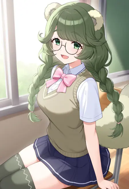 animal ears,green eyes,twin braids,glasses,long hair,green hair,raccoon tail,