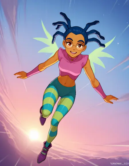 taranee_cook, blue hair, 1girl, dreadlocks, glasses, brown eyes, witch_guardian suit, turquoise and green-striped tights, pink top, fire magic, wings,