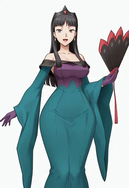 BB clothes,black tiara,dress,hand fan,aqua dress,gloves,purple gloves,bare shoulders,purple wide sleeves,