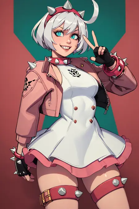 Strive: striveelphelt, ahoge, hairband, jacket, dress, fingerless gloves, thighhighs, spiked collar, spiked bracelet