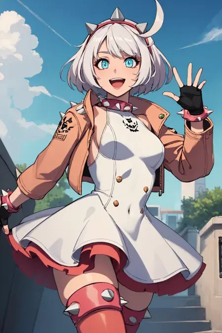 奋斗者: striveelphelt, ahoge, 发带, 夹克, 连衣裙, 露指手套, 过膝袜, 带刺项圈, 带刺手镯