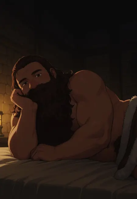 | トレーニングワード | Dunmeshi_Senshi, 1boy, solo, dwarf, muscular, black eyes, brown hair, long hair, mustache, very long beard, コピーしました! horned helmet, covered face, white sleeveless shirt, brown arm guards, belt, fur-trimmed skirt, shin guards, sandals, コピーしました! |