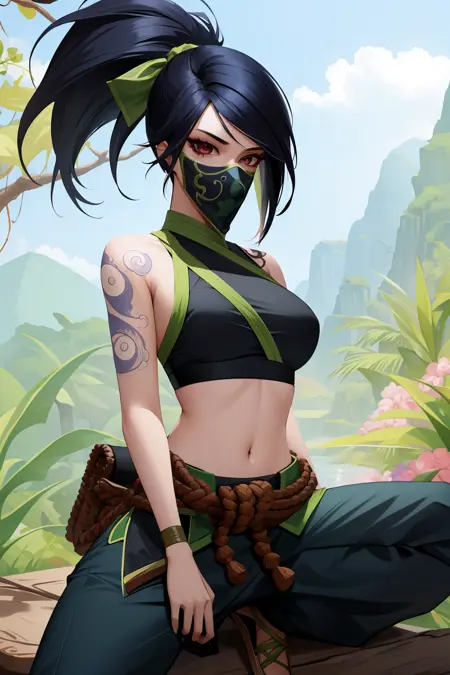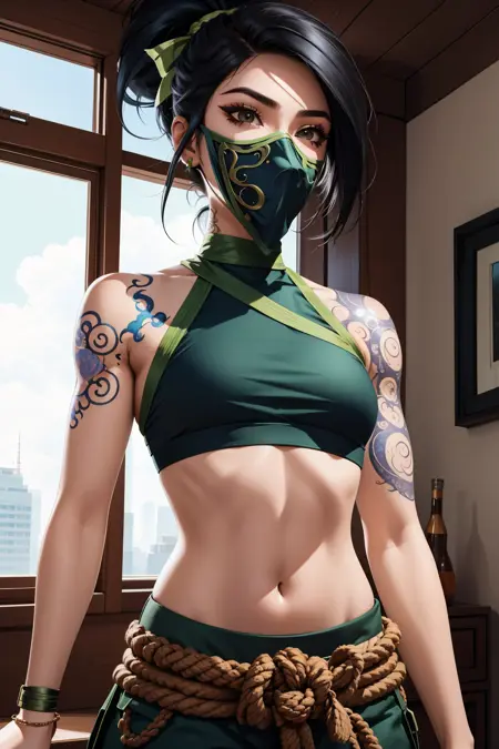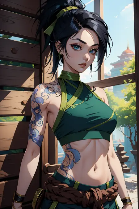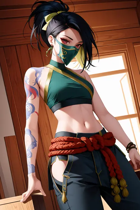 akali: akali, 1girl, crop top, pants, hair ribbon, bare shoulders, ponytail, tattoo, black hair