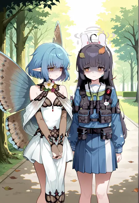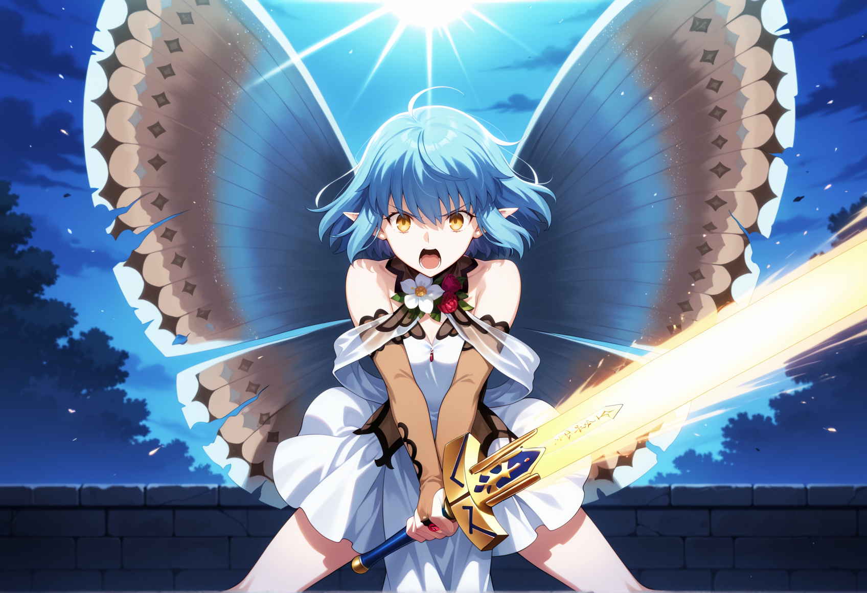 Notable tags: short hair, blue hair, pointy ears, yellow eyes, short dress, bare shoulders, flower ornament, bridal gauntlets, moth wings, damaged wings