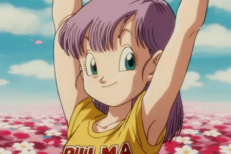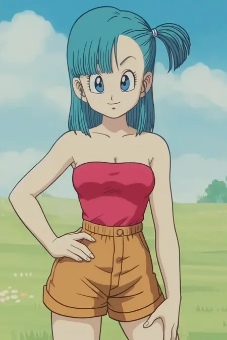 블루마, 드래곤볼 \(클래식\), 파란 눈, 청록색 머리카락, 한쪽 올린 머리, 빨간 스크런치, 어깨 길이 머리,