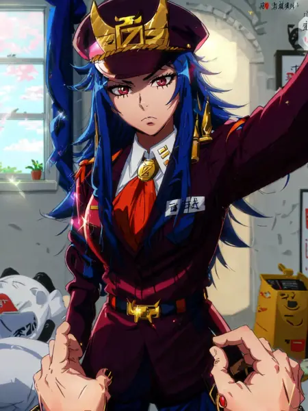 표준 복장에 대한 키워드 세트: HyakushikiMomoko, 1girl, uniform, military uniform, long sleeves, hat, jacket, belt