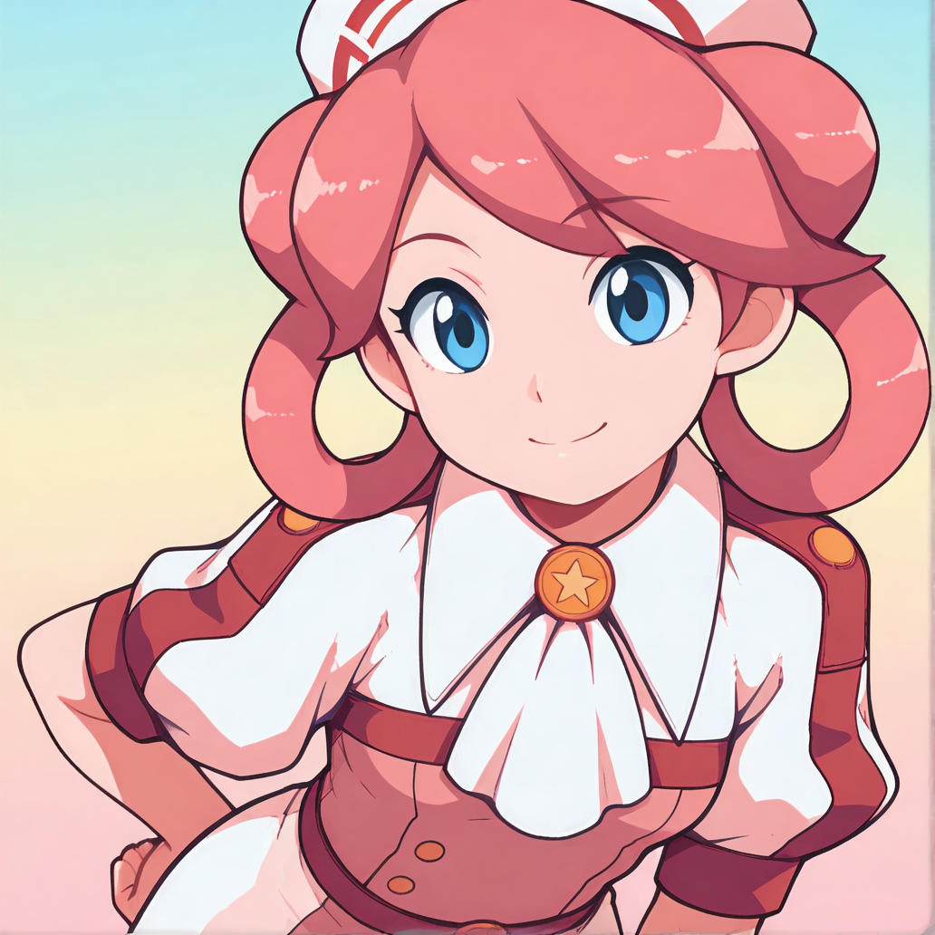 trista, trista \(pokemon\), pink hair, blue eyes, medium hair, nurse cap, white headwear, pink shirt, white ascot, puffy short sleeves, white skirt, ankle boots, white footwear