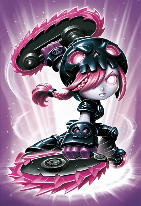 1girl, Roller_brawl, pink hair, braided hair, skull Helmet, pink eyes, black armor, large breasts,