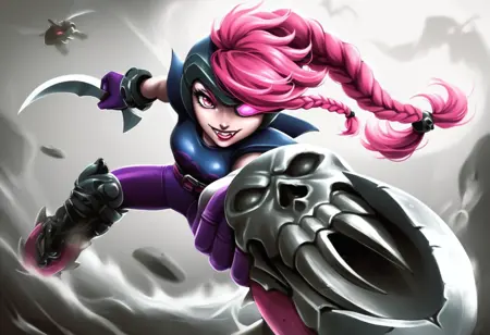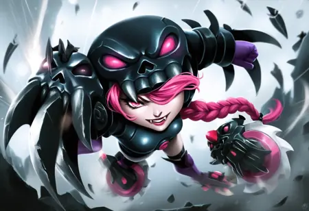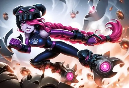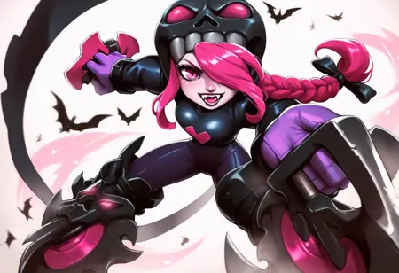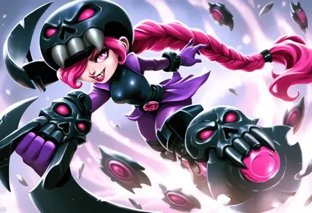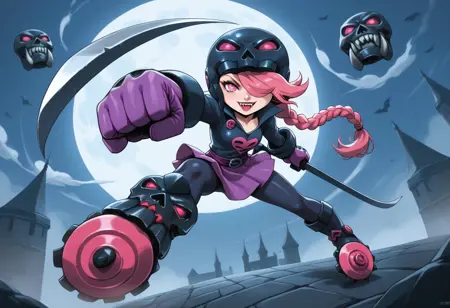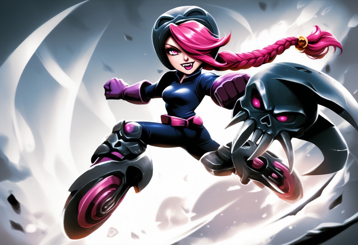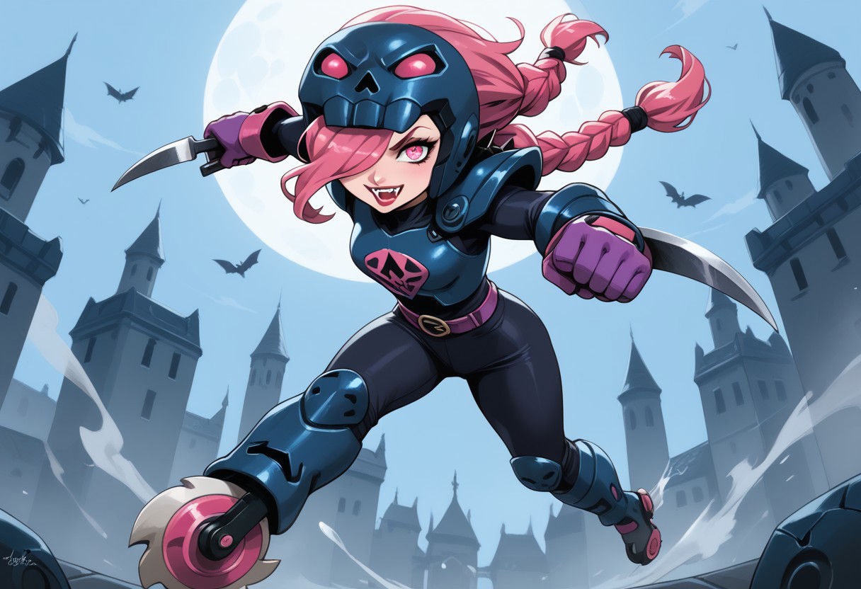 ((purplish pale skin, braid, pink hair, Black skull helmet with pink glowing eyes, armor, hair over one eye, pink eyes, roller skates, saw blade skates, purple gloves, braided hair, black armor, full body, ))