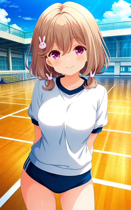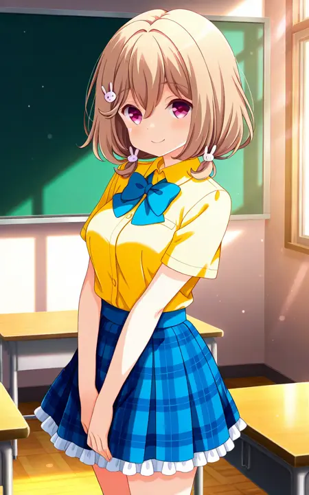 Trigger words: kazemachiharuka, light brown hair, low twintails, hair between eyes, hairclip, rabbit hair ornament, short hair, pink eyes