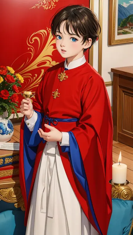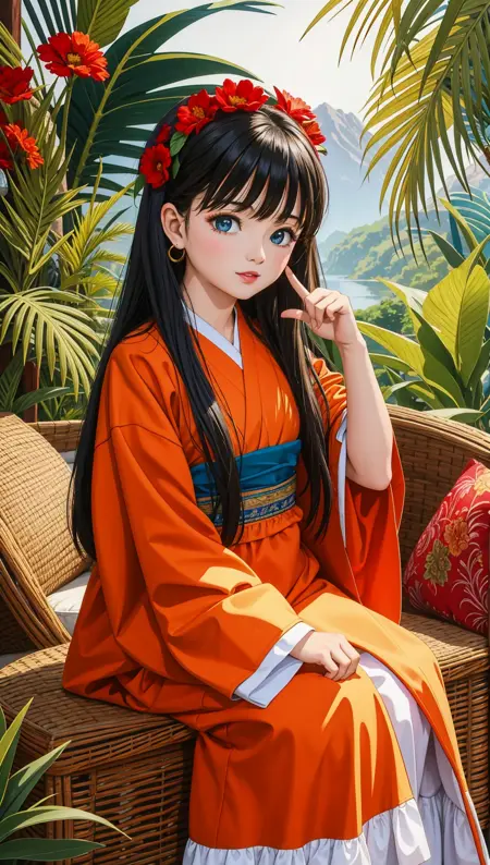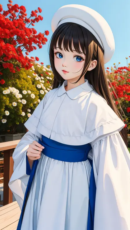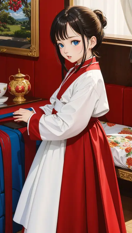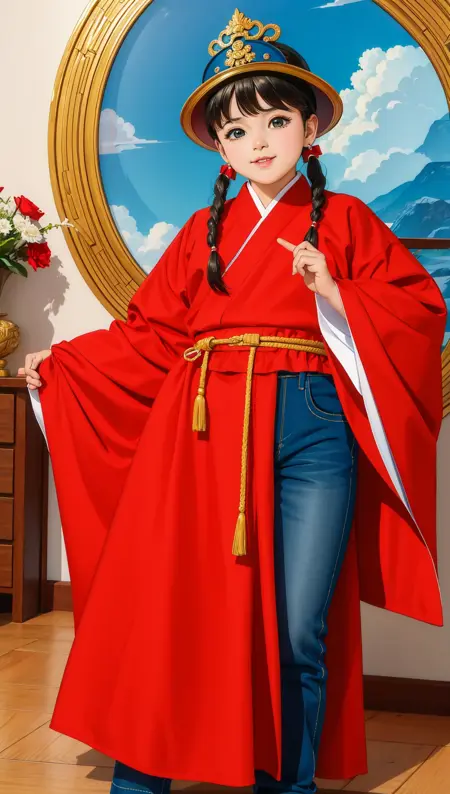 long sleeves, hair ornament, chinese clothes, dress, hair bun, flower, double bun, fur trim, red dress, skirt, bangs, shoes, hanfu, hair flower, wide sleeves, floral print, sandals, white footwear, hanbok, bag, hand fan, braid, jacket, hair rings, holding fan, paper fan, red skirt, lantern, ribbon, outstretched arms, child, pink skirt, long skirt, jewelry, basket, animal ears, red footwear
