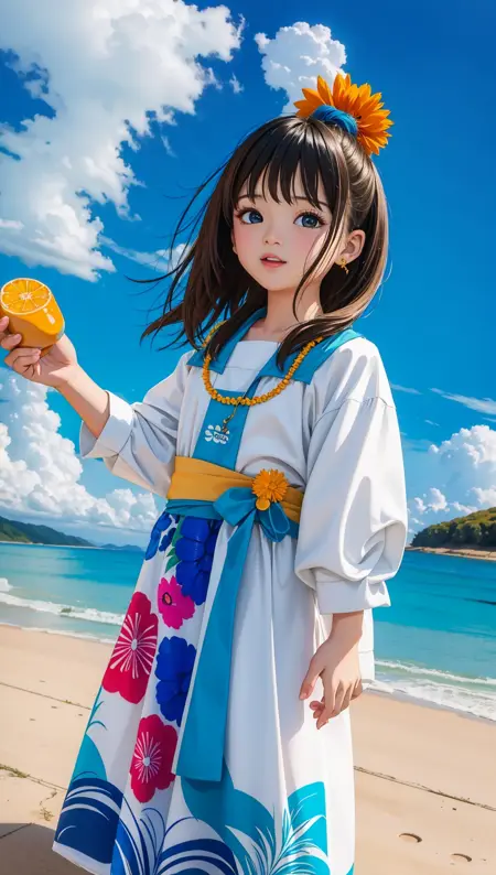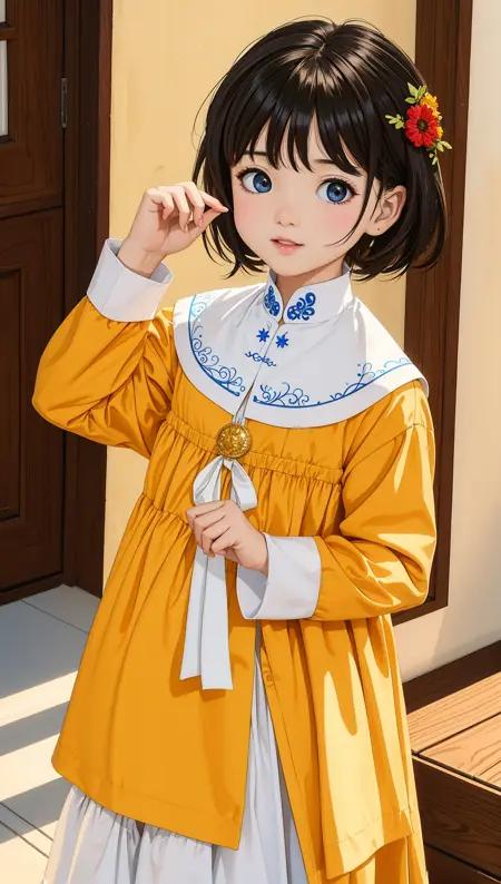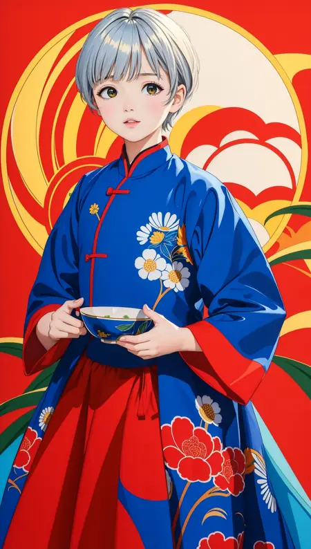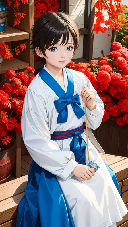 long sleeves, hair ornament, chinese clothes, dress, hair bun, flower, double bun, fur trim, red dress, skirt, bangs, shoes, hanfu, hair flower, wide sleeves, floral print, sandals, white footwear, hanbok, bag, hand fan, braid, jacket, hair rings, holding fan, paper fan, red skirt, lantern, ribbon, outstretched arms, child, pink skirt, long skirt, jewelry, basket, animal ears, red footwear