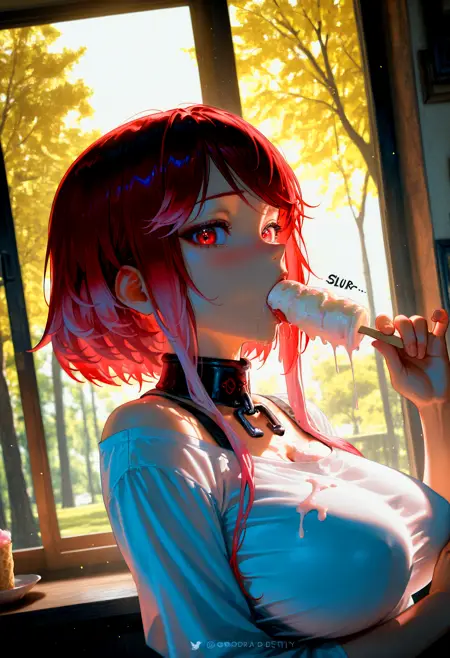 1girl, 빨간 눈, 긴 머리카락이 달린 짧은 헤어스타일, 그라데이션 헤어, 다채로운 헤어, 빨간 머리, 분홍 머리, 큰 가슴, (두꺼운 허벅지:1.2), 넓은 골반,