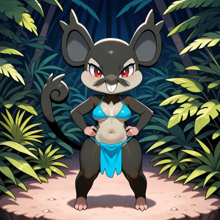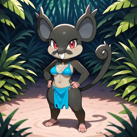 rodent, pokemon (creature), mouse, black and brown fur, red eyes, large ears, bucktooth, tail,