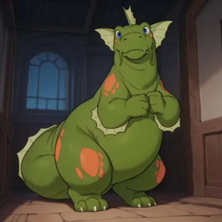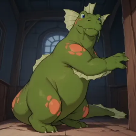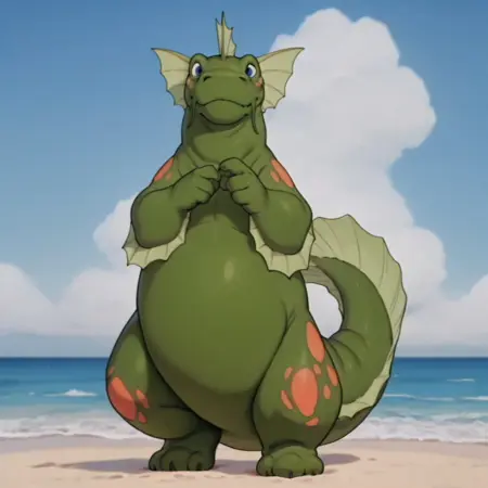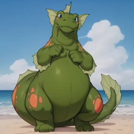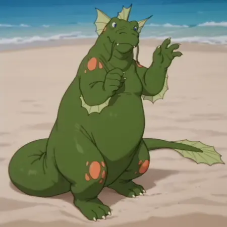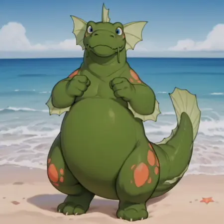 seamonsterDSil, feral, monster, green skin, orange spots, head fins, blue eyes,