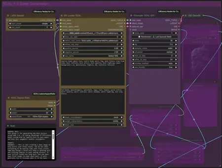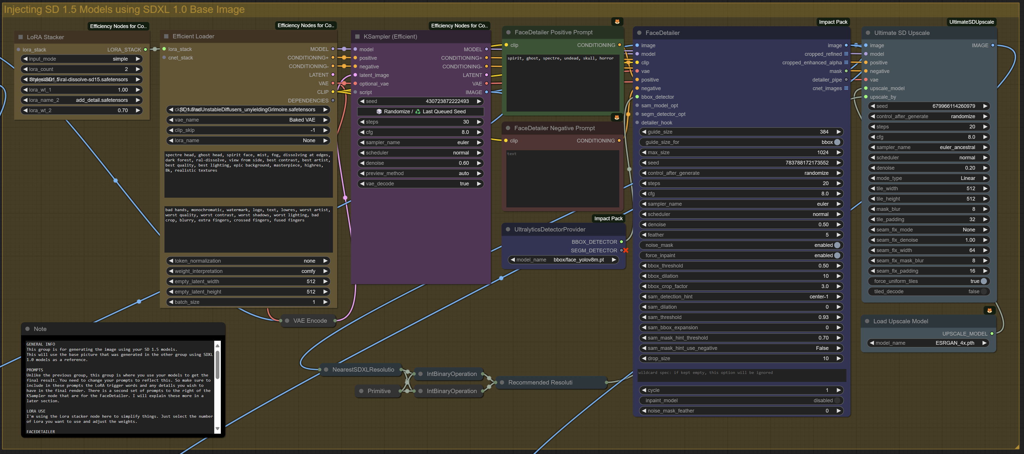 本工作流使用了 Efficiency Nodes 和部分 Impact Pack 节点。我在工作流中的每个分组内都添加了说明节点以协助您。请注意,如果您生成的图像异常或似乎未完全渲染,极有可能是 VAE 问题。我在说明节点中对此进行了详细解释,只需重新加载工作流即可轻松解决。