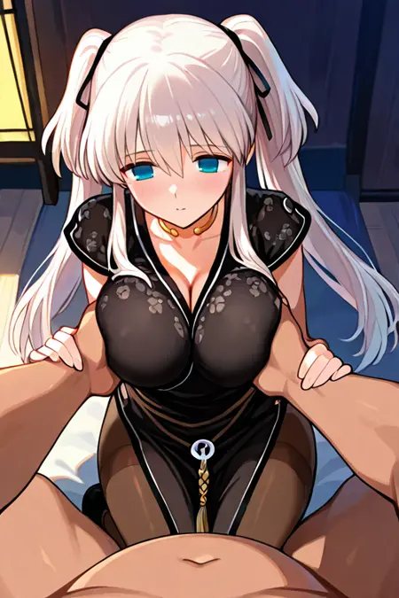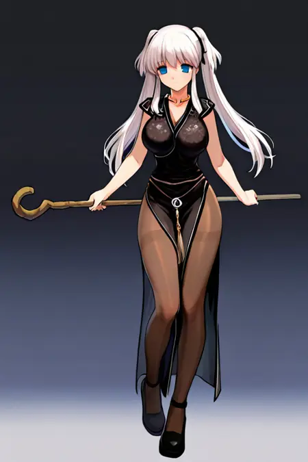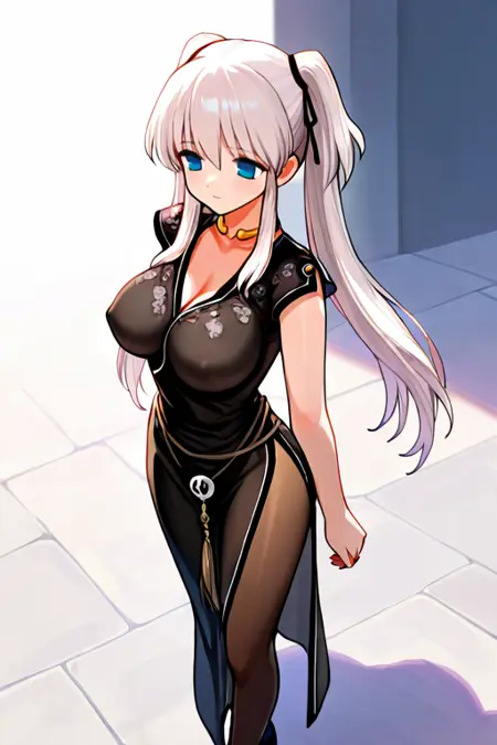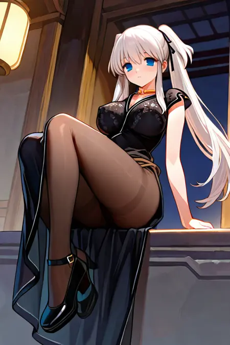 큰 가슴, naoDef, 목고리, 검은 드레스, 사이드 슬릿, 팬티후스, 검은 신발,