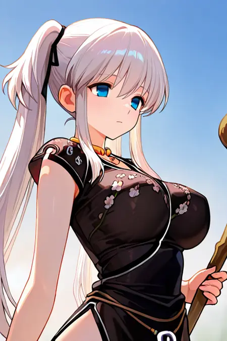 1girl, solo, nao_(mabinogi), 긴 머리, 트윈테일, 흰 머리카락, 사이드락, 검은 머리리본, 파란 눈,