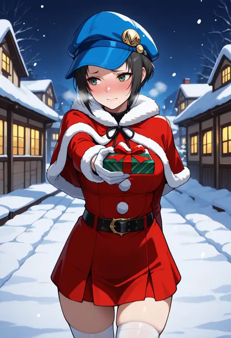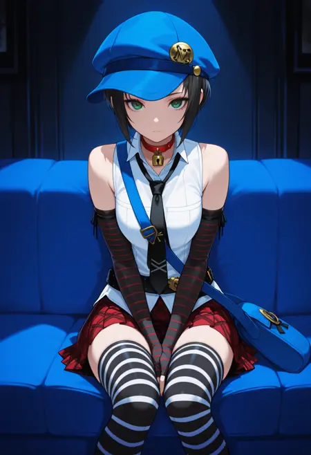 Default Outfit: blue headwear, cabbie hat, sleeveless shirt, collared shirt, black necktie, striped gloves, elbow gloves, fingerless gloves, red skirt, plaid skirt, pleated skirt, striped thighhighs, red collar, lock, shoulder bag, bare shoulders