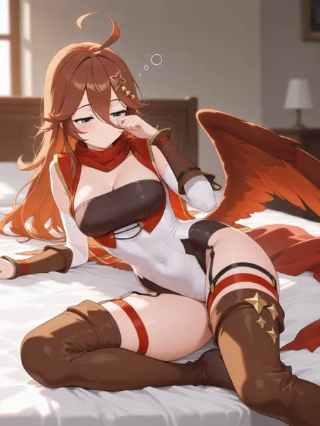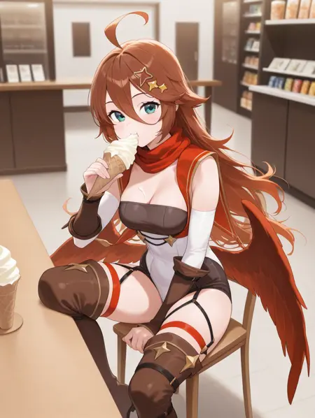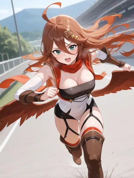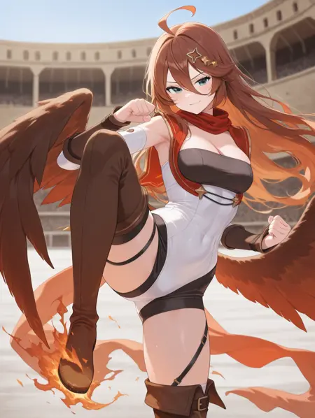 scintilla, 1girl, solo, 갈색 머리카락, 긴 머리카락, ahoge, 눈 사이 머리카락, 녹색 눈, 날개, 중간 크기 가슴, 가슴 사이 틈, 머리 장식, 빨간 스카프, 스카프, 별(기호), 허벅지 홀더, 분리형 소매, 별 모양 머리 장식, 레오타드, 허벅지 긴 양말, 갈색 신발, 부츠, 허벅지 부츠,