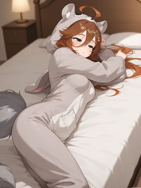 scintilla, 1girl, solo, 갈색 머리카락, 긴 머리카락, ahoge, 눈 사이 머리카락, 녹색 눈, 중간 크기 가슴, 머리 장식, 별(기호), 별 모양 머리 장식, 원지, 후드, 동물 귀, 동물 코스튬, 회색 후드, 동물 후드, 후드, 회색 꼬리,