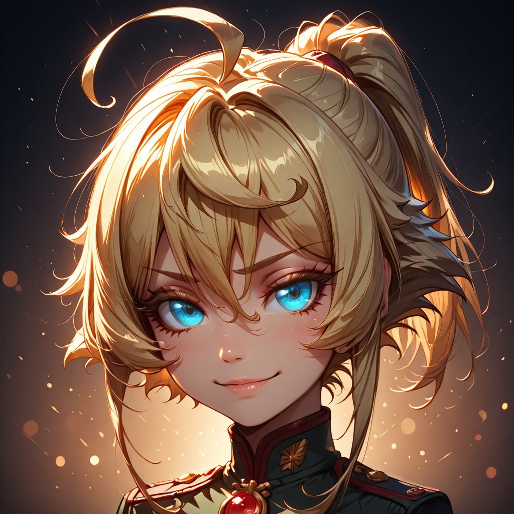 キャラクターの外見:1girl、金髪、青目の少女、小さな胸、高いポニーテール、アンテナ髪、長い髪の束が付いた短髪、アホ毛、