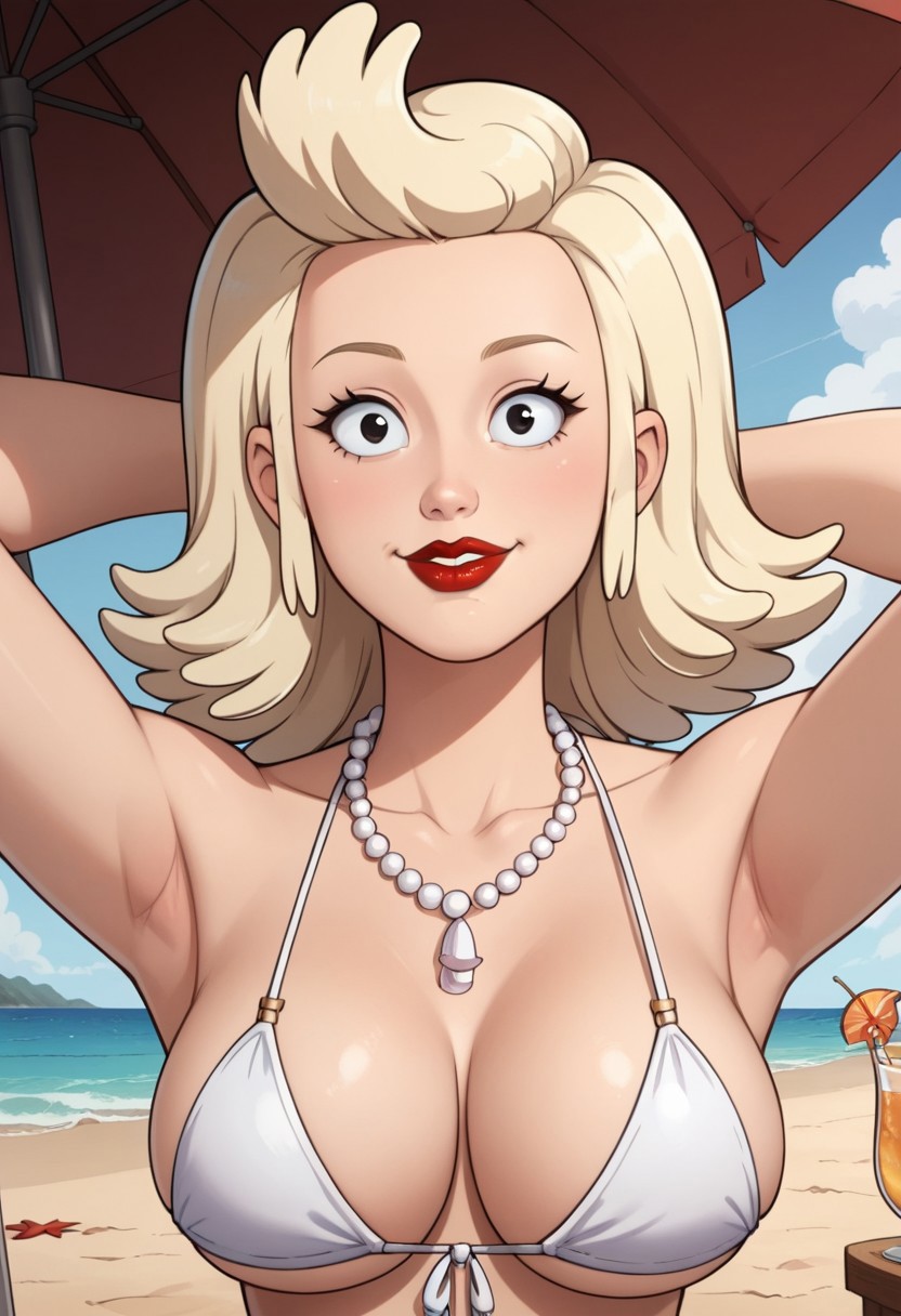 1girl, solo, Mona_RS, 밝은 피부, 검은 눈, 밝은 금발, 볼륨 있는 곱슬머리, 올라간 앞머리, 빨간 립스틱, 긴 진주 목걸이