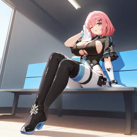 TimidoHi3, 분홍색 머리, 회색 눈, 중간 길이 머리, 밥컷, 검정 재킷, 칼라 재킷, 헤어 클립, 사이드 컷아웃, 닫힌 재킷, 연한 파랑 트림, 연한 파랑 스트랩, 짧은 소매, 검정 소매, 주름 소매, 하얀색 한 손 장갑, 비대칭 장갑, 연한 파랑 한 손가락 장갑, 언더부브 컷아웃, 팔찌, 하arness, 허벅지 파우치, 프릴이 있는 바지, 흰색 바지, 의상 컷아웃, 검정 브라, 홀터넥, 흰색 리벳, 옷 아래 리벳, 검정 허벅지 부츠, 바지 안에 부츠, 계층적 다리 착용,