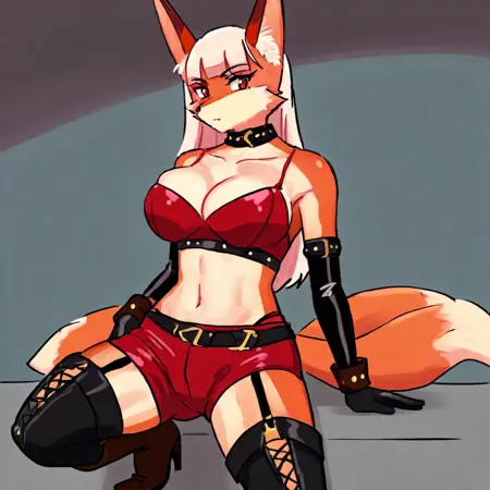 DNF_Marcella, 1girl, solo, red eyes, furry, furry female, white hair, long hair, animal ears, fox ears, fox tail, tail, large breasts, navel, cleavage, red shorts, garter straps, collar, leather, gloves, thighhighs, leather boots