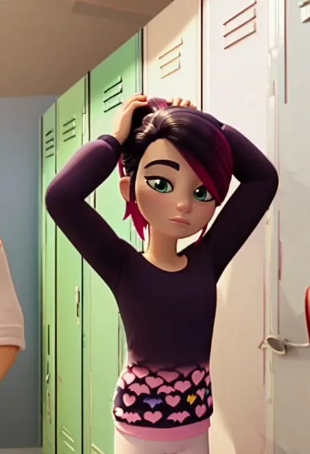 Liv Baker, ponytail, cyan eyes, purple sweater, heart and bat print, dark hair, dyed hair, highlights, white jeans, black-white-pink and blue-colored high-top sneakers,