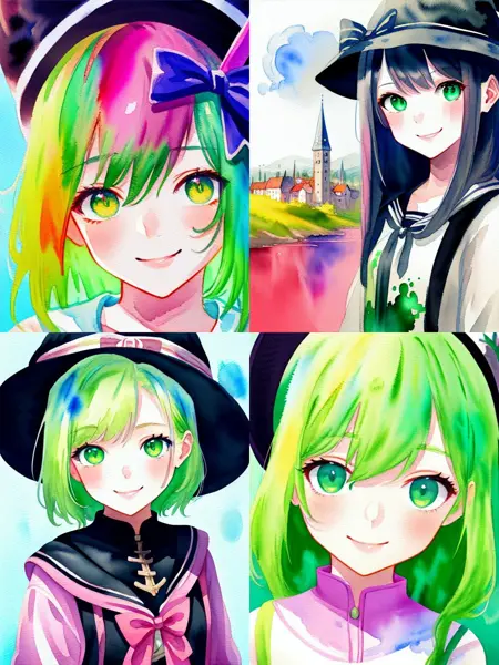 (watercolor ambient:1.2), (Medieval town), 8k wallpaper, 1girl, black Witch Student, innocent smile, Pale pink_hair, green witch hat, (ultra-detailed), sharp focus